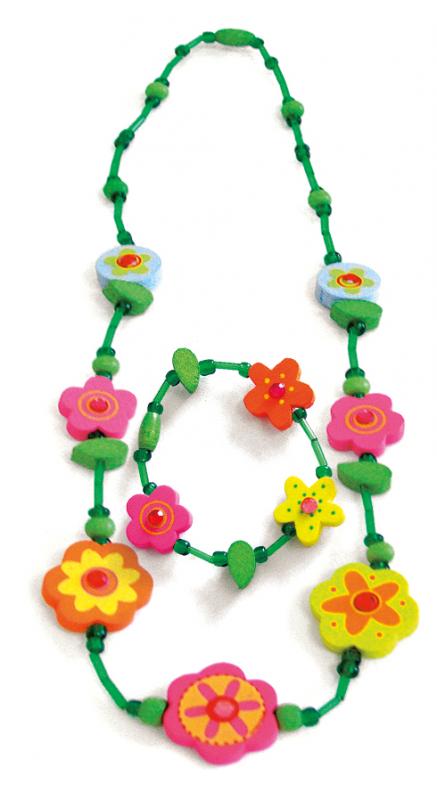 Necklase and bracelet set - green with flowers, set 6pcs